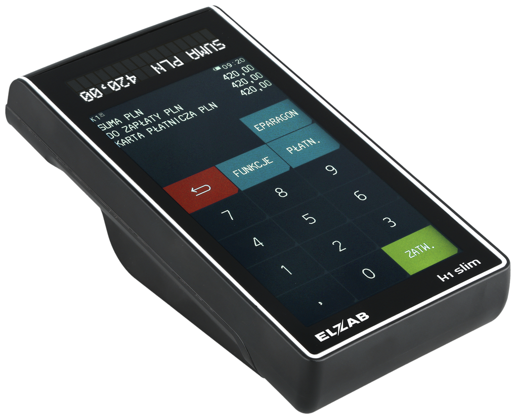 ELZAB K1 Slim to kieszonkowa kasa fiskalna ONLINE zamknięta w unikalnej obudowie o rozmiarze zbliżonym do smartfona. Mobilna, poręczna i lekka – bez trudu mieści się w dłoni, torebce czy kieszeni.